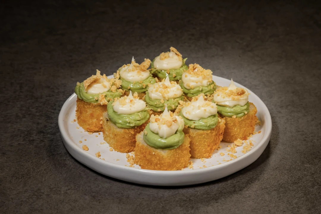 Item exclusivo! Roll de arroz empanado na Panko, frito, finalizado com creme de pistache, chocolate branco e paçoca.